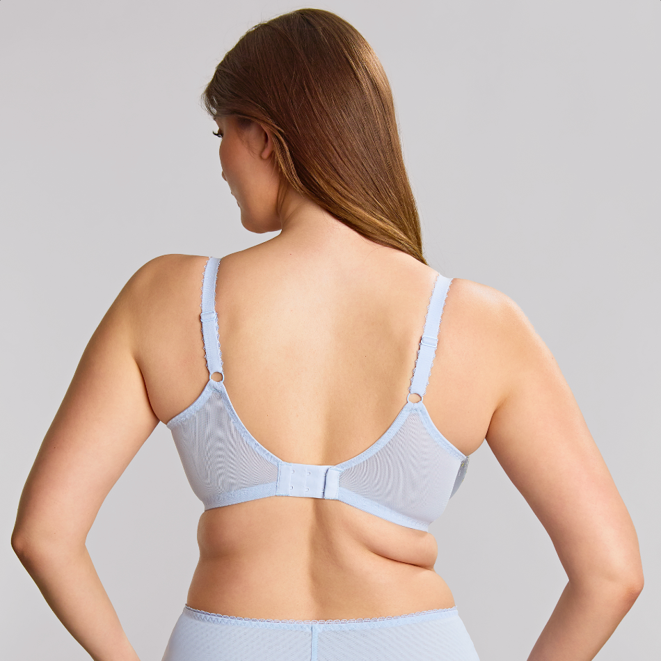 Detail is everything in our enchanting new Meadow range! This brand new plunge style embodies all things Spring. A delicate, floral embroidery bursting with colour sits with a clean dusty blue tulle and is paired with super pretty trim and strap detailing. The rigid, lined cups sit on the cradle offering a flattering forward projection and comfortable fit.